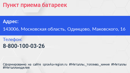 Пункт приема батареек по адресу 143006, Московская область, Одинцово, Маковского, 16 в дальнейшем Организация, размещена в следующих категориях: