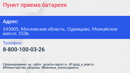 Пункт приема батареек по адресу 143005, Московская область, Одинцово, Можайское шоссе, 153в в дальнейшем Организация, размещена в следующих категориях: