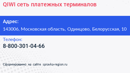 QIWI, сеть платежных терминалов по адресу 143006, Московская область, Одинцово, Белорусская, 10 в дальнейшем Организация, размещена в следующих категориях: