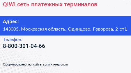 QIWI, сеть платежных терминалов по адресу 143005, Московская область, Одинцово, Говорова, 2 ст1 в дальнейшем Организация, размещена в следующих категориях: