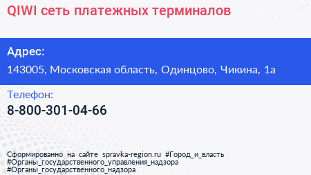 QIWI, сеть платежных терминалов по адресу 143005, Московская область, Одинцово, Чикина, 1а в дальнейшем Организация, размещена в следующих категориях: