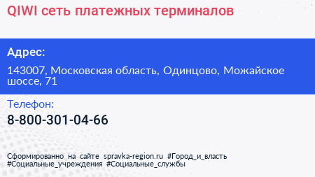 QIWI, сеть платежных терминалов по адресу 143007, Московская область, Одинцово, Можайское шоссе, 71 в дальнейшем Организация, размещена в следующих категориях: