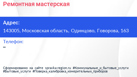 Ремонтная мастерская по адресу 143005, Московская область, Одинцово, Говорова, 163 в дальнейшем Организация, размещена в следующих категориях: