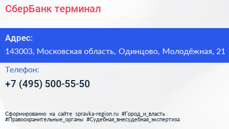 СберБанк, терминал по адресу 143003, Московская область, Одинцово, Молодёжная, 21 в дальнейшем Организация, размещена в следующих категориях: