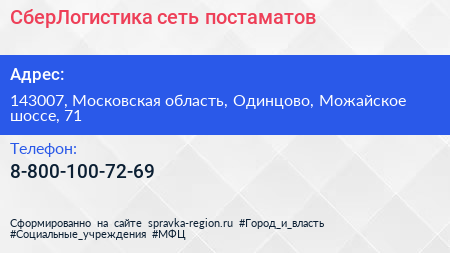СберЛогистика, сеть постаматов по адресу 143007, Московская область, Одинцово, Можайское шоссе, 71 в дальнейшем Организация, размещена в следующих категориях: