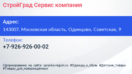 СтройГрад Сервис, компания по адресу 143007, Московская область, Одинцово, Советская, 9 в дальнейшем Организация, размещена в следующих категориях: