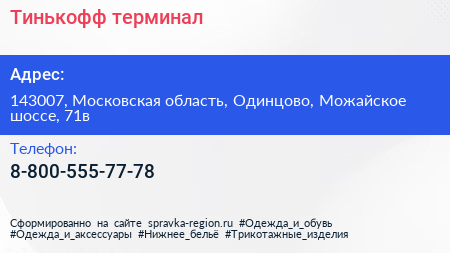 Тинькофф, терминал по адресу 143007, Московская область, Одинцово, Можайское шоссе, 71в в дальнейшем Организация, размещена в следующих категориях: