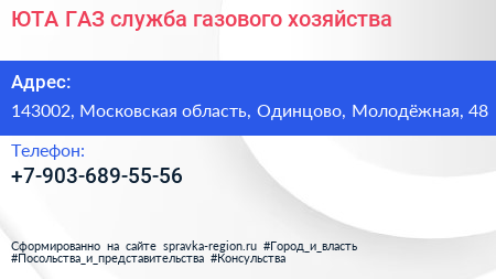 ЮТА-ГАЗ, служба газового хозяйства по адресу 143002, Московская область, Одинцово, Молодёжная, 48 в дальнейшем Организация, размещена в следующих категориях: