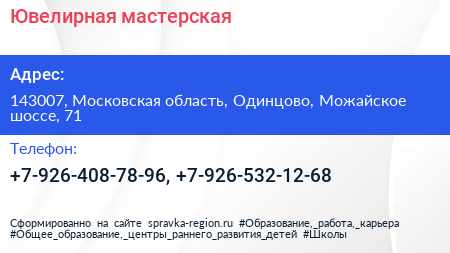 Ювелирная мастерская по адресу 143007, Московская область, Одинцово, Можайское шоссе, 71 в дальнейшем Организация, размещена в следующих категориях: