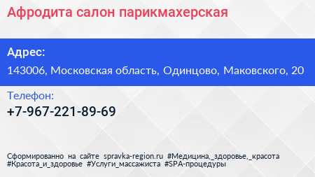 Афродита, салон-парикмахерская по адресу 143006, Московская область, Одинцово, Маковского, 20 в дальнейшем Организация, размещена в следующих категориях: