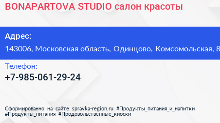 BONAPARTOVA STUDIO, салон красоты по адресу 143006, Московская область, Одинцово, Комсомольская, 8 в дальнейшем Организация, размещена в следующих категориях: