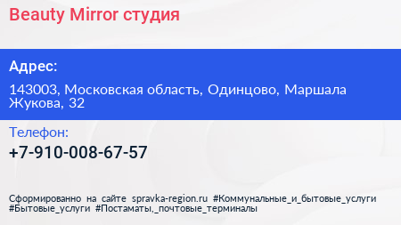 Beauty Mirror, студия по адресу 143003, Московская область, Одинцово, Маршала Жукова, 32 в дальнейшем Организация, размещена в следующих категориях: