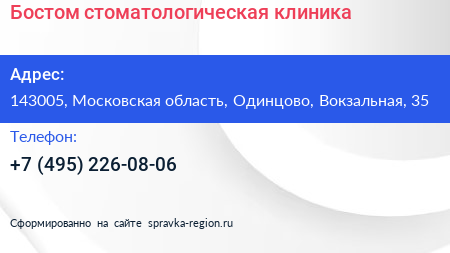 Бостом, стоматологическая клиника по адресу 143005, Московская область, Одинцово, Вокзальная, 35 в дальнейшем Организация, размещена в следующих категориях:
