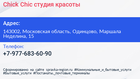 Chick & Chic, студия красоты по адресу 143002, Московская область, Одинцово, Маршала Неделина, 15 в дальнейшем Организация, размещена в следующих категориях: