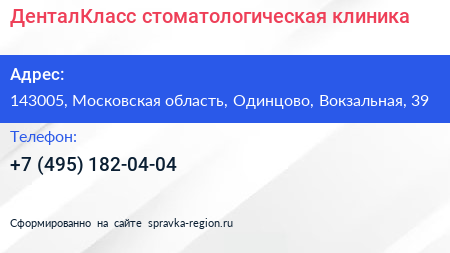 ДенталКласс, стоматологическая клиника по адресу 143005, Московская область, Одинцово, Вокзальная, 39 в дальнейшем Организация, размещена в следующих категориях: