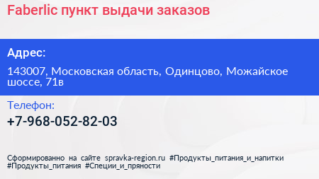 Faberlic, пункт выдачи заказов по адресу 143007, Московская область, Одинцово, Можайское шоссе, 71в в дальнейшем Организация, размещена в следующих категориях: