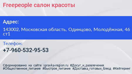 Freepeople, салон красоты по адресу 143002, Московская область, Одинцово, Молодёжная, 46 ст1 в дальнейшем Организация, размещена в следующих категориях: