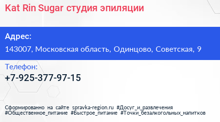 Kat Rin Sugar, студия эпиляции по адресу 143007, Московская область, Одинцово, Советская, 9 в дальнейшем Организация, размещена в следующих категориях:
