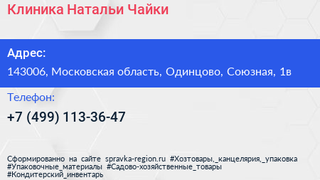 Клиника Натальи Чайки по адресу 143006, Московская область, Одинцово, Союзная, 1в в дальнейшем Организация, размещена в следующих категориях:
