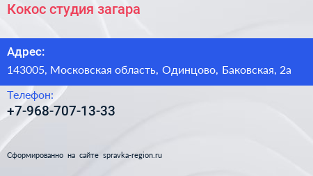 Кокос, студия загара по адресу 143005, Московская область, Одинцово, Баковская, 2а в дальнейшем Организация, размещена в следующих категориях: