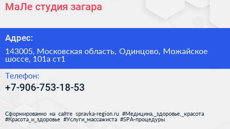 МаЛе, студия загара по адресу 143005, Московская область, Одинцово, Можайское шоссе, 101а ст1 в дальнейшем Организация, размещена в следующих категориях: