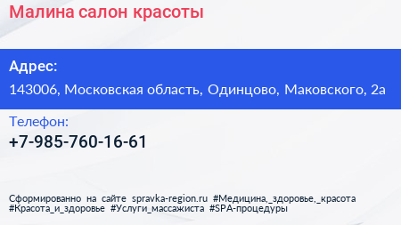Малина, салон красоты по адресу 143006, Московская область, Одинцово, Маковского, 2а в дальнейшем Организация, размещена в следующих категориях: