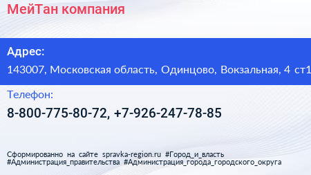 МейТан, компания по адресу 143007, Московская область, Одинцово, Вокзальная, 4 ст1 в дальнейшем Организация, размещена в следующих категориях: