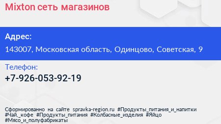 Mixton, сеть магазинов по адресу 143007, Московская область, Одинцово, Советская, 9 в дальнейшем Организация, размещена в следующих категориях: