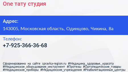 One, тату-студия по адресу 143005, Московская область, Одинцово, Чикина, 8а в дальнейшем Организация, размещена в следующих категориях: