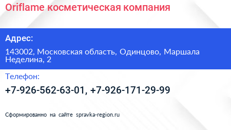 Oriflame, косметическая компания по адресу 143002, Московская область, Одинцово, Маршала Неделина, 2 в дальнейшем Организация, размещена в следующих категориях: