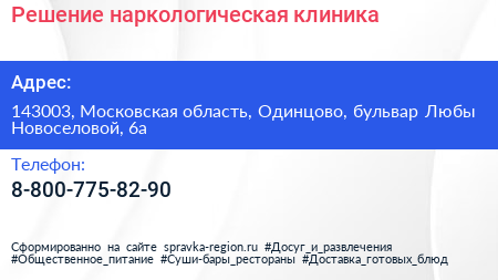 Решение, наркологическая клиника по адресу 143003, Московская область, Одинцово, бульвар Любы Новоселовой, 6а в дальнейшем Организация, размещена в следующих категориях: