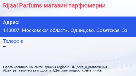Rijaal Parfums, магазин парфюмерии по адресу 143007, Московская область, Одинцово, Советская, 5а в дальнейшем Организация, размещена в следующих категориях:
