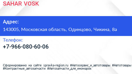 SAHAR & VOSK по адресу 143005, Московская область, Одинцово, Чикина, 8а в дальнейшем Организация, размещена в следующих категориях: