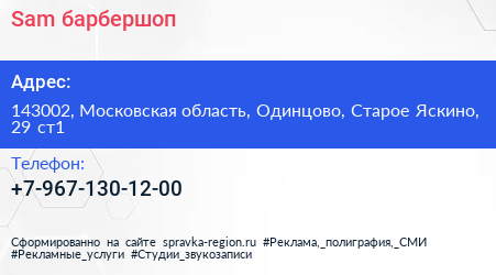 Sam, барбершоп по адресу 143002, Московская область, Одинцово, Старое Яскино, 29 ст1 в дальнейшем Организация, размещена в следующих категориях: