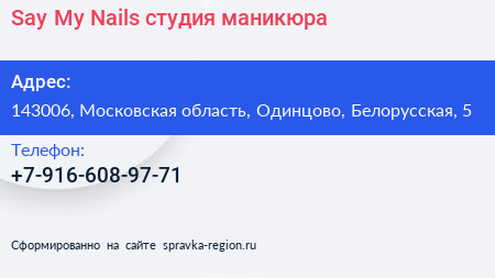 Say My Nails, студия маникюра по адресу 143006, Московская область, Одинцово, Белорусская, 5 в дальнейшем Организация, размещена в следующих категориях:
