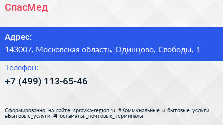 СпасМед по адресу 143007, Московская область, Одинцово, Свободы, 1 в дальнейшем Организация, размещена в следующих категориях: