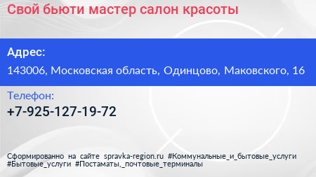 Свой бьюти-мастер, салон красоты по адресу 143006, Московская область, Одинцово, Маковского, 16 в дальнейшем Организация, размещена в следующих категориях: