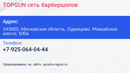 TOPGUN, сеть барбершопов по адресу 143005, Московская область, Одинцово, Можайское шоссе, 100а в дальнейшем Организация, размещена в следующих категориях: