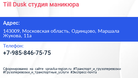 Till Dusk, студия маникюра по адресу 143009, Московская область, Одинцово, Маршала Жукова, 11а в дальнейшем Организация, размещена в следующих категориях: