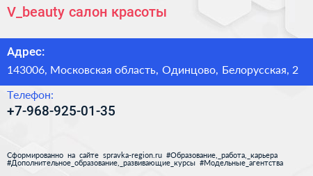 V_beauty, салон красоты по адресу 143006, Московская область, Одинцово, Белорусская, 2 в дальнейшем Организация, размещена в следующих категориях: