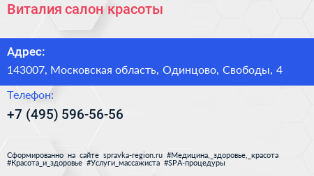 Виталия, салон красоты по адресу 143007, Московская область, Одинцово, Свободы, 4 в дальнейшем Организация, размещена в следующих категориях: