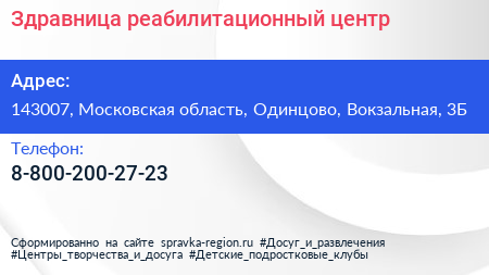 Здравница, реабилитационный центр по адресу 143007, Московская область, Одинцово, Вокзальная, 3Б в дальнейшем Организация, размещена в следующих категориях: