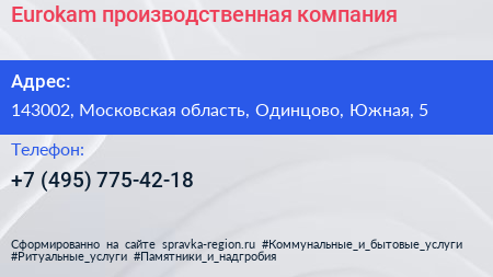 Eurokam, производственная компания по адресу 143002, Московская область, Одинцово, Южная, 5 в дальнейшем Организация, размещена в следующих категориях: