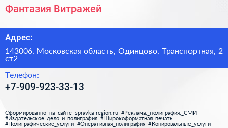 Фантазия Витражей по адресу 143006, Московская область, Одинцово, Транспортная, 2 ст2 в дальнейшем Организация, размещена в следующих категориях: