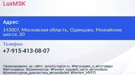 LuxMSK по адресу 143007, Московская область, Одинцово, Можайское шоссе, 20 в дальнейшем Организация, размещена в следующих категориях:
