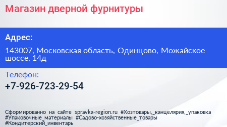 Магазин дверной фурнитуры по адресу 143007, Московская область, Одинцово, Можайское шоссе, 14д в дальнейшем Организация, размещена в следующих категориях:
