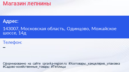 Магазин лепнины по адресу 143007, Московская область, Одинцово, Можайское шоссе, 14д в дальнейшем Организация, размещена в следующих категориях: