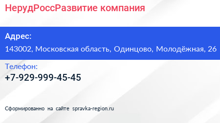 НерудРоссРазвитие, компания по адресу 143002, Московская область, Одинцово, Молодёжная, 26 в дальнейшем Организация, размещена в следующих категориях: