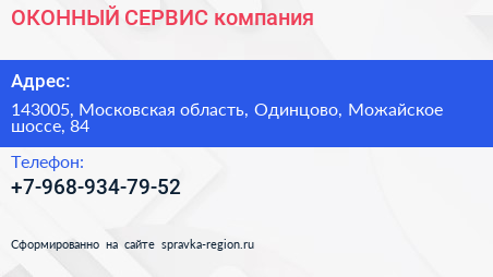 ОКОННЫЙ СЕРВИС, компания по адресу 143005, Московская область, Одинцово, Можайское шоссе, 84 в дальнейшем Организация, размещена в следующих категориях: