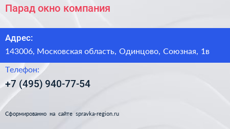 Парад окно, компания по адресу 143006, Московская область, Одинцово, Союзная, 1в в дальнейшем Организация, размещена в следующих категориях: